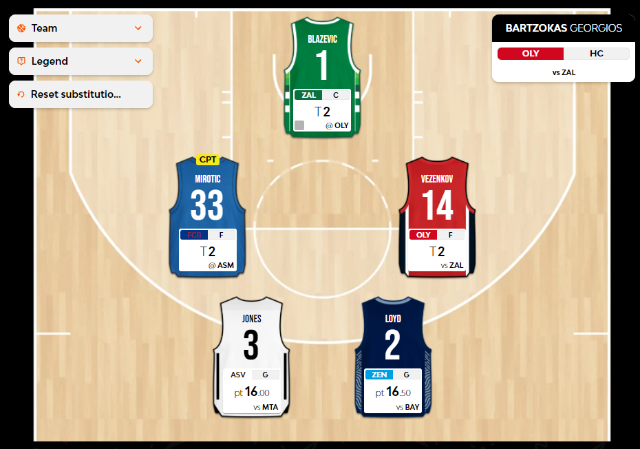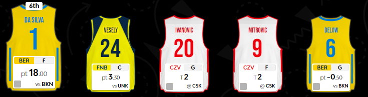 Από την άλλη, η επιλογή του Loyd έναντι του Okobo δεν αποδείχθηκε σωστή, με τον πρώτο να προσφέρει 16,5 φαντασιακούς πόντους και τον Γάλλο της Βιλερμπάν να φτάνει στο 21 ράνκινγκ. Ο Okobo μάλιστα ανέλαβε χρέη ηγέτη στην ομάδα του κατά την απόπειρα ανατροπής με την Μακάμπι, με αποτέλεσμα στο δεύτερο ημίχρονο να παραγκωνιστεί ο Jones, παρόλο που στο πρώτο μέρος ήταν θετικός για την ομάδα του. Ο Αμερικανός βέβαια ακόμα κι έτσι έφτασε στο 16 Index Rating, κάτι που τον κρατάει βασικό, όπως εξάλλου και τον Loyd, που αν δεν έκανε το τουλάχιστον χαζό και αχρείαστο τέταρτο φάουλ ένα λεπτό πριν τη λήξη του τρίτου δεκαλέπτου θα μπορούσε να τα είχε πάει καλύτερα. Ο γκαρντ της Ζενίτ πάντως έκανε ρεκόρ καριέρας στις ασσίστ (11), έχοντας ήδη 7 από το πρώτο δεκάλεπτο.