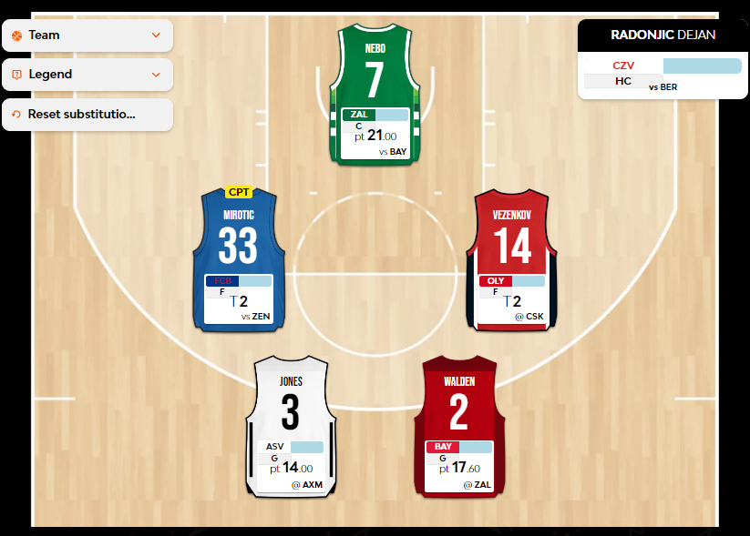 Ενόψει της δεύτερης αγωνιστικής μέρας, σίγουρα βασικοί παραμένουν οι Nebo (21) και Walden (17,6), με τους Mirotic και Vezenkov επίσης να προορίζονται να δώσουν το 100% του σκορ τους. Ο σταρ της Μπαρτσελόνα θα είναι εξάλλου ο αρχηγός της ομάδας για μία ακόμη φορά, κάτι που θα γινόταν ακόμα κι αν το χρίσμα την πρώτη μέρα το είχε πάρει ο Walden.