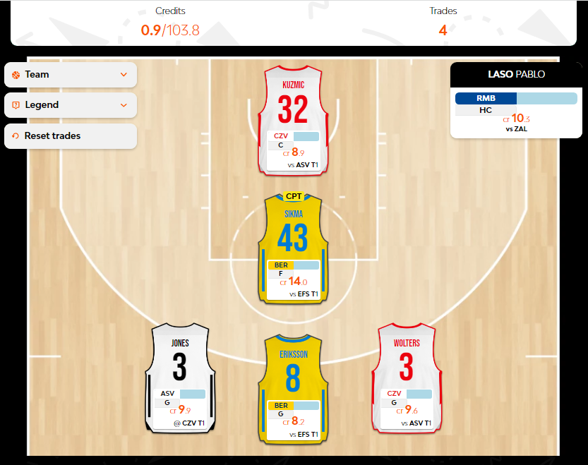 Από εκεί και πέρα, υπήρχε ένα βασικό πλάνο το οποίο όμως φαίνεται πολύ πιθανό να αλλάξει, λόγω των εξελίξεων. Στη θέση του σέντερ, αντί του Nebo, είχα σημαδέψει τον Tibor Pleiss της Εφές, που είναι εξαιρετικά αποδοτικός ελλείψει του Dunston. Τρία ράνκινγκς 19+ στα τέσσερα τελευταία ματς, χωρίς μάλιστα τον πολύ χρόνο συμμετοχής (πάντα χαμηλότερα από τα 23') και άλμα 0,5 κρέντιτς σε Last 4. Απέναντι στην Άλμπα θεωρώ πως μπορεί να δικαιολογήσει αρχικά την τιμή του και γιατί όχι να συνεχίσει σε υψηλά νούμερα.
