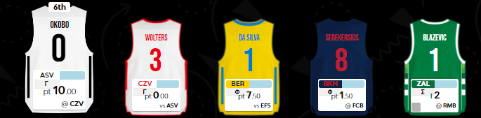 Ο προπονητής της Ρεάλ έχει θεωρητικά στο τσεπάκι τους 10 πόντους με την Ζαλγκίρις και αν δεν στραβώσουν πολύ τα πράγματα μπορεί να φέρει 20 πολυπόθητους πόντους, ενώ ο ηγέτης της Μπάγερν περνά βασικός και μάλιστα αρχηγός, παίρνοντας το περιβραχιόνιο από τον Luke Sikma, που πραγματοποίησε την πρώτη του φετινή απογοητευτική εμφάνιση με την Εφές. Το 5 Index Rating από τον πιο ακριβό παίκτη της ομάδας απευθείας χαμηλώνει αρκετά τον πήχη για το σκορ της αγωνιστικής, ενώ δεν πήγαν και πολύ καλύτερα οι υπόλοιποι παίκτες της Άλμπα: 9 ράνκινγκ για τον Eriksson και πολλά μονοψήφια/αρνητικά από τους υπόλοιπους παίκτες των Γερμανών, ενώ ο Da Silva παρέμεινε εξαιρετικός, αφού κατάφερε να φτάσει στο 15, στην πρώτη μάλιστα φορά που ο χρόνος συμμετοχής του έπεσε από τα 20 λεπτά (19:36)! Δυστυχώς για την ομάδα βέβαια, οι πόντοι του μειώνονται στο μισό, αφού δόθηκε προτεραιότητα στον Eriksson για τη βασική πεντάδα.