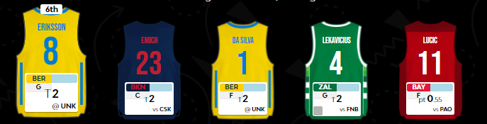 Από την άλλη, δεν μπορώ να θεωρήσω δεδομένη μια νέα καλή παρουσία του Eriksson με την Ζενίτ, κάτι όμως με οδηγεί στη δική του προτίμηση. Ίσως η περισσότερη εμπειρία που έχει, ίσως το δύσκολο ματσάρισμα των γκαρντ της Βιλερμπάν που θεωρητικά θα μπορούσε ένας εξ αυτών να περάσει στον πάγκο για χάρη του Σουηδού κόντρα στην πράσινη Ούνιξ, ίσως ένα μεγαλύτερο φαντασιακό "δέσιμο" μαζί του, μιας και αποκτήθηκε μία αγωνιστική πριν μπει στο ραντάρ των περισσότερων παικτών, με κάνουν να περάσω τον γκαρντ της Άλμπα ως έκτο παίκτη, αφήνοντας τον Enoch με την ΤΣΣΚΑ αναπληρωματικό, φοβούμενος μια πιθανή παγίδα. Όλα αυτά βέβαια θα κριθούν από το αποτέλεσμα, αλλά σε κάθε περίπτωση θα υπάρξει όφελος, έστω και στο 50%, μαζί με το οικονομικό σκέλος φυσικά.