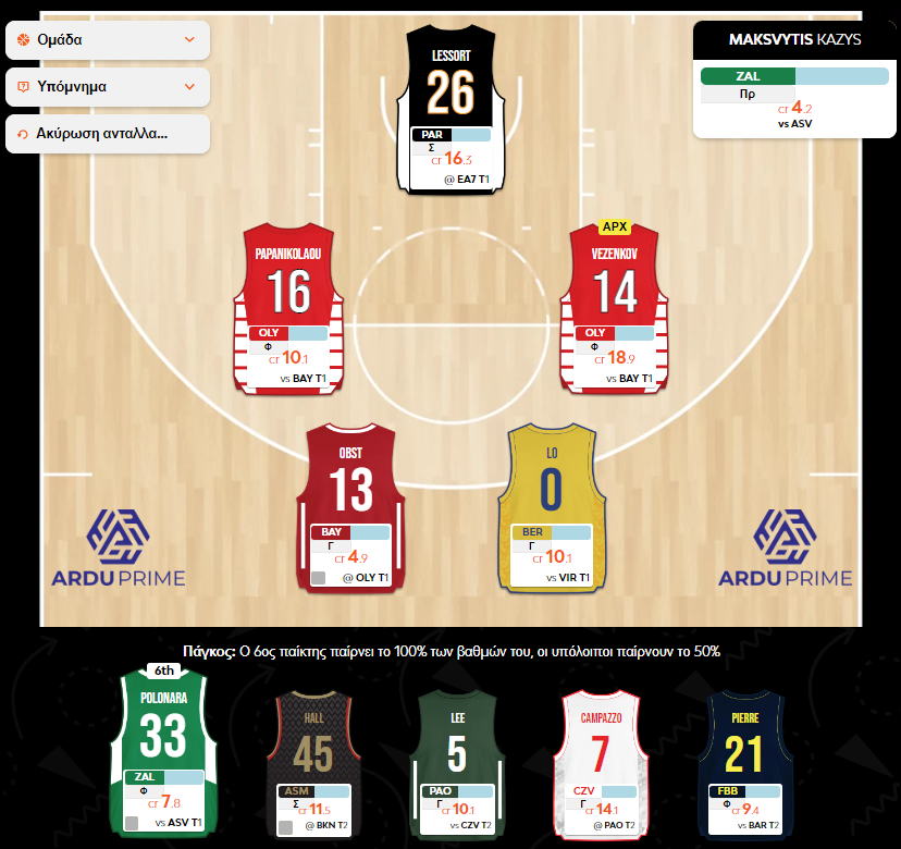 Εναλλακτικά, μπορεί στη θέση του Cohen να έρθει ένας παίκτης σαν τον Polonara, που ίσως …εκκολάπτει μομέντουμ στα τελευταία ματς. Στη θέση του Ιταλού εξετάστηκαν τόσο ο συμπαίκτης του, Brazdeikis, όσο και ο Mitrovic, αν και ο δεύτερος παίζει στο Turn 2 και δεν βολεύει ιδιαίτερα. Όσο για τον Λιθουανό, δεν δείχνει άσχημη επιλογή, όμως η φαντασιακή μου συμπάθεια για τον Polonara με ωθεί να του δώσω την ευκαιρία. Τόσο ο Lo, όσο και ο Polonara αγωνίζονται στο Turn 1 και διαμορφώνουν την εσωτερική κατανομή της ομάδας σε 6-4, που είναι σαφώς πιο αρεστή.