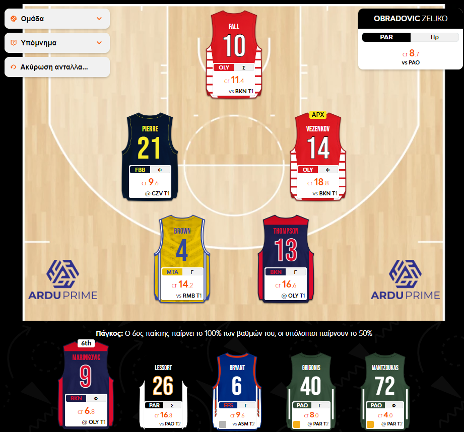 Με τα δεδομένα που υπάρχουν αυτή την στιγμή λοιπόν, την πρώτη μέρα αγωνίζονται οι Fall, Vezenkov, Pierre, Marinkovic, Thompson και Brown και τη δεύτερη ακολουθούν οι Lessort, Bryant, Grigonis, Μαντζούκας. Ο Μαντζούκας και τραυματίας δεν με πειράζει, αν όμως ο Grigonis έχει σίγουρο DNP τότε είναι λογικό η τρίτη αλλαγή να πραγματοποιηθεί εκεί. Ούτως ή άλλως, είμαστε όλοι εν αναμονή εξελίξεων που μπορούν να διαφοροποιήσουν το πλάνο των ομάδων μας.