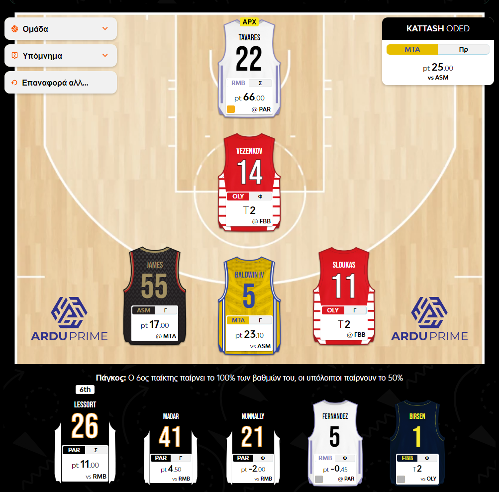 Αρχηγός check, βασικό σχήμα check, προπονητής επίσης check, με την Μακάμπι να κάνει ό,τι θέλει χθες απέναντι στην Μονακό και τον Κάτας να χαρίζει απλόχερα 25 πόντους (και λίγοι ήταν) στους μάνατζερ που τον εμπιστεύθηκαν. Συνολικά λοιπόν στην εβδομάδα, ο Ισραηλινός είναι σαν να πραγματοποίησε δύο μονοψήφιες νίκες με τους Μονεγάσκους (20 πόντοι). Τρία σημεία-κλειδιά είναι καλυμμένα για την ομάδα, επομένως, με βάση και την απόδοση των παικτών του Ολυμπιακού σήμερα, η High Voltage μπορεί να συνεχίσει την ανοδική της πορεία στα playoffs, έχοντας συγκεντρώσει για την ώρα 144,2 πόντους.