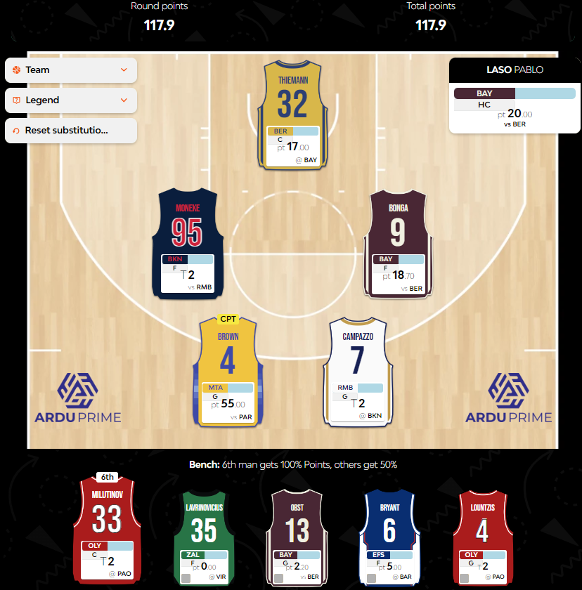 Οι περισσότεροι παίκτες της ομάδας αγωνίζονταν στο Μόναχο χθες, εκεί όπου η Μπάγερν επικράτησε εύκολα τελικά της Άλμπα με 80-68, με τον Πάμπλο Λάσο να χαρίζει έτσι ένα υπερπολύτιμο 20άρι από τη θέση του προπονητή. Το σκορ του Ισπανού κόουτς προσέγγισε και ο παίκτης του, Isaac Bonga, με τον Γερμανό να επιβεβαιώνει πλήρως τις προσδοκίες και με μια πληθωρική παρουσία πάνω στο παρκέ να ολοκληρώνει την αναμέτρηση με double double 11 πόντων και 10 ρημπάουντ για 17 PIR και 18,7 φαντασιακούς πόντους. Από κοντά και ο αντίπαλός του, Johannes Thiemann με 12 πόντους, 5 ρημπάουντ και 5 κερδισμένα φάουλ για 17 Index Rating, σημειώνοντας έτσι κι αυτός ένα άτυπο double score σε σχέση με την αρχική του τιμή σε κρέντιτς.