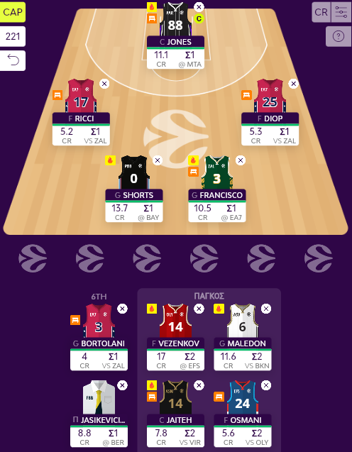 Tyrique Jones, έχοντας κυρίαρχη πρεμιέρα μέσα στην Μπασκόνια (28), πολύ θετική παρουσία στην Μαδρίτη με τα θηρία (16), αλλά και άλλη μια κομπλέ εμφάνιση σε σχετικά λίγο χρόνο μάλιστα με την Μπάγερν για την 3η αγωνιστική (16). Πέραν της καθ' εαυτής παρουσίας του στο ζωγραφιστό, ο ρυθμός με τον οποίο κερδίζει τα φάουλ (6,7 μ.ο.) είναι στοιχείο πολύτιμο για κάθε φαντασιακό παίκτη κι έτσι στα 11,1 κρέντιτς και σχεδόν διπλάσιο μέσο όρο μοιάζει εξαιρετική επιλογή.