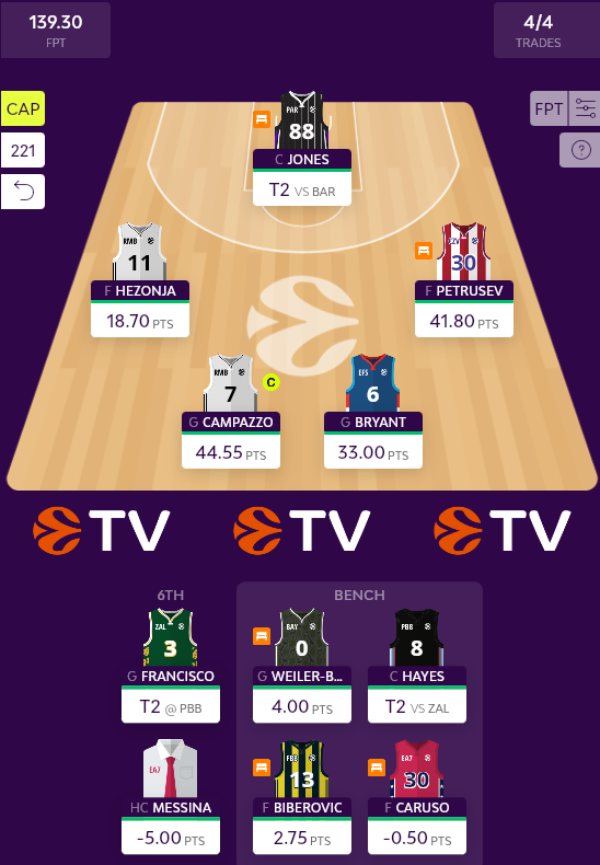 Προφανώς Petrusev και Bryant θα παραμείνουν στο βασικό σχήμα, παρέα με το δίδυμο της Ρεάλ Campazzo-Hezonja, που αυτή τη φορά απέδωσε τα αναμενόμενα κι έτσι μείωσαν έμμεσα τη χασούρα της προηγούμενης αγωνιστικής (από την Μιλάνο...) με το 29,7 του Campazzo φυσικά να είναι το πιο σημαντικό εδώ, αφού ο Αργεντίνος είχε χρίσμα αρχηγού. Σε κάτι λιγότερο από 24 λεπτά ο πλέι μέικερ της Ρεάλ σκόραρε 14 πόντους, μοίρασε 9 ασσίστ και κέρδισε 5 φάουλ, ενώ ο συμπαίκτης του αγωνίστηκε αισθητά περισσότερο (30:15), για να σκοράρει 20 πόντους με 8/15 σουτ και να μαζέψει 5 ρημπάουντ, με 1 μόλις κερδισμένο φάουλ.