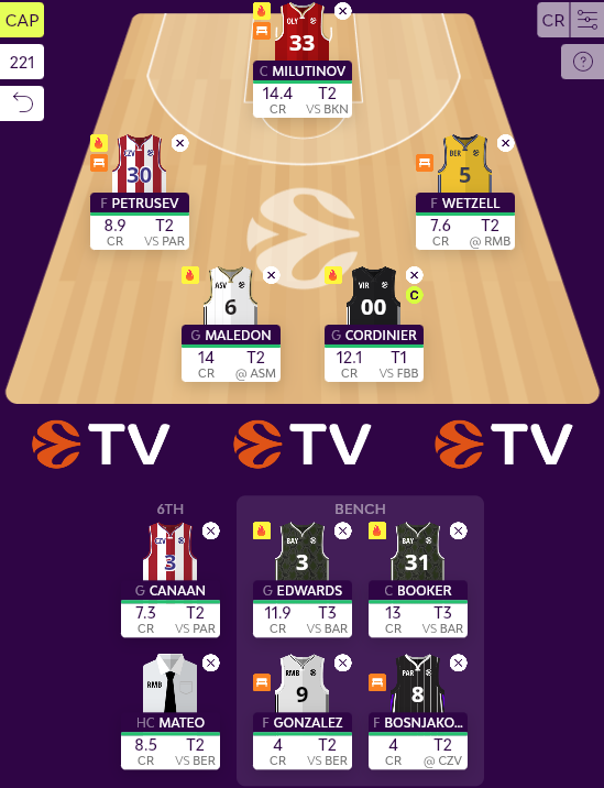 Κι αυτό γιατί θα ήθελα άλλο ένα καλό όνομα στο ρόστερ, με διψήφιο σίγουρα κόστος. Εδώ εξέτασα τις περιπτώσεις των Sedekerskis, Hezonja στους F και των Bryant, Cordinier στους γκαρντ. Οι δύο πρώτοι "κόπηκαν", ο πρώτος λόγω ΣΕΦ και ο δεύτερος γιατί "κούρασε" με την κατώτερη των περιστάσεων απόδοσή του, παρότι έχει ευνοϊκό ματς που θα στοχεύσει λογικά σε ατομικό επίπεδο. Όσον αφορά τους γκαρντ, ο Bryant αποτελεί πιο οικονομική περίπτωση, αλλά η πρόσφατη αστάθειά του συν το γεγονός ότι βάσει του αρχικού υπολογισμένου χρόνου, ο Larkin αναμένεται να γυρίσει τώρα στα κοντά, με ωθούν περισσότερο στον Cordinier, ως μακροπρόθεσμη επιλογή, με τον Γάλλο βέβαια να έχει και το πλεονέκτημα ότι αγωνίζεται στο πρώιμο Turn1 της αγωνιστικής, προσφέροντας έτσι μια έξτρα επιλογή αρχηγού, που πιθανώς θα χρειαστεί. Ο περιφερειακός της Μπολόνια έχει ανεβάσει ξανά την απόδοσή του, βγάζοντας μια δυναμική για ακόμα υψηλότερα οικονομικά στρώματα στη θέση των γκαρντ του παιχνιδιού κι έτσι στα 12,1 κρέντιτς θα πορευτώ με το αναβαθμισμένο του στάτους στην Βίρτους και στο παιχνίδι συνολικά.