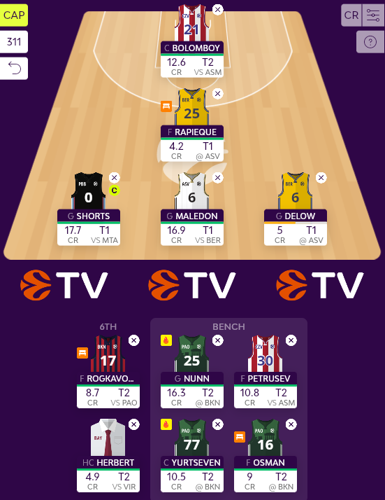 Έτσι, το όλο ζήτημα είναι το δίδυμο των σέντερ της ομάδας, με μία αλλαγή να απομένει. Θα έρθει ο Booker στη θέση του Bolomboy, ή ο Yurtseven στη θέση του McCormack; Ο δεύτερος υπερισχύει ως προς το T1, αλλά γι' αυτό το λόγο θα μπορούσα να είχα φέρει τον Wetzell, αντί του Osman (το οποίο δεν βγάζω βέβαια εντελώς από το κάδρο). Τρέφοντας ελπίδες για το σκορ του σέντερ του Παναθηναϊκού στην Μπασκόνια και μην επιθυμώντας να αποχωρίζομαι παίκτες μετά από ένα στραβοπάτημα, τείνω προς το δίδυμο Bolomboy-Yurtseven, χωρίς να μπορώ να το θεωρήσω οριστικό.