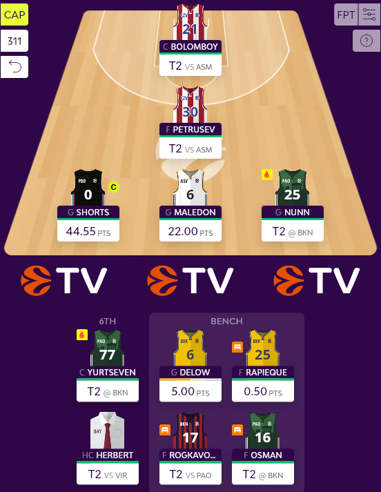 Καλύτερος όλων για την ομάδα ο TJ Shorts, που δικαίωσε τον ερχομό του με 29,7 φαντασιακούς πόντους και 44,55 συνολικά με το χρίσμα του αρχηγού, σημειώνοντας double double 11 πόντων (4/5 δίποντα, 0/0 τρίποντα, 3/4 βολές) και 14 ασσίστ απέναντι στην Μακάμπι, έχοντας παράλληλα 3 λάθη, 5 ρημπάουντ και 3-4 φάουλ σε 23 μόνο λεπτά συμμετοχής. Ένα μεγάλο σκορ έλειπε από την πιο πρόσφατη συλλογή του ρούκι της Παρί και η απερχόμενη αντίπαλός του αποδείχθηκε ιδανική γι' αυτό, όπως εξάλλου και με τον Campazzo, δύο μέρες πριν.