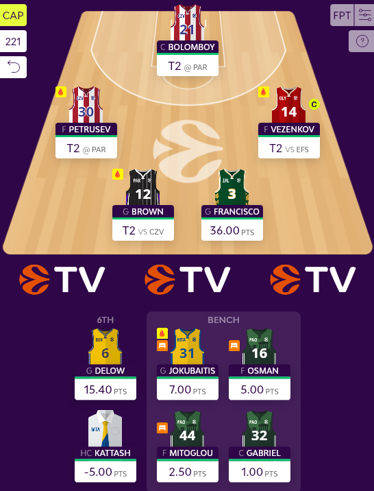 Οι σημερινές εσωτερικές αλλαγές προκύπτουν μάλλον αυτόματα, αφού και οι τέσσερις παίκτες που αγωνίζονται στο Turn 2, Vezenkov, Petrusev, Bolomboy, Brown, θα περάσουν βασικοί μαζί με Francisco και Delow. Το σενάριο να διαλέγω παίκτη να μείνει εκτός (Brown δηλαδή) αντί του Jokubaitis (14) έχει βάση, αλλά δεν θα το επιλέξω.