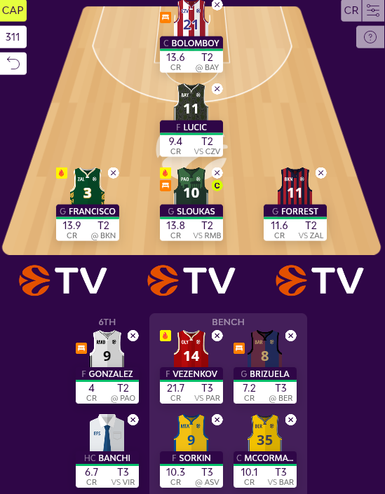 Αναφορικά με τους παίκτες που ξεχωρίζω στην αγορά, στους γκαρντ πάντα υπάρχουν οι Shorts-Maledon, ενώ ο Guduric συνεχίζει να αποδίδει και να εμπεριέχει υποτίμηση. Στα ίδια κρέντιτς εξάλλου υπάρχει και ο Forrest της Μπασκόνια, ενώ και το εντός έδρας στοιχείο του Fournier είναι ελκυστικό, παρότι κοστίζει πιο ακριβά. Στους φόργουορντ, το στάτους του Sorkin παραμένει αναβαθμισμένο λόγω της απουσίας του Hoard, ενώ και η εντός έδρας απόδοση του φορμαρισμένου Juancho δεν περνά απαρατήρητη. Αντιθέτως, στους σέντερ δεν βλέπω κάποιον προφανή στόχο, κάτι που με κάνει να εξετάζω και την ανεπιθύμητη γενικά περίπτωση να στραφώ σε μια πολύ φθηνή δεύτερη λύση, κάτι βέβαια που η συγκεκριμένη αγωνιστική ίσως το επιτρέπει λίγο παραπάνω (Bolomboy παίζει μέσα στην πράσινη Μπάγερν, ενώ είναι ερωτηματικό και ο Petrusev).