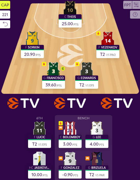 MVP της βραδιάς για την ομάδα ο Francisco που οδήγησε την Ζαλγκίρις σε μια σπουδαία ανατροπή επί της Παρί φτάνοντας τους 26,4 φαντασιακούς πόντους, που του επιτρέπουν μάλιστα με άνεση να διατηρήσει και το περιβραχιόνιο της αρχηγίας στα χέρια του. Ο Γάλλος τελείωσε το ημίχρονο στο -1 PIR (λίγο πριν το 20άλεπτο μάλιστα τον είδα στο -4), αλλά έδειξε για άλλη μια φορά τα clutch γονίδιά του ολοκληρώνοντας την αναμέτρηση με 15 πόντους (3/4 δίποντα, 2/8 τρίποντα, 3/4 βολές), 6 ρημπάουντ, 8 ασσίστ, 5 κερδισμένα φάουλ και το νικητήριο καλάθι σε 30:44 συμμετοχής.