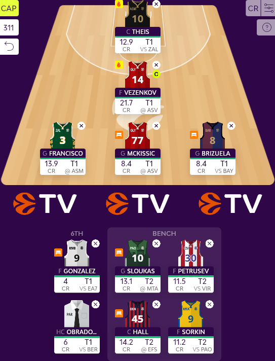 Daniel Theis στη θέση του συμπαίκτη του, Jaiteh, με τον Γερμανό να αποδίδει για τρίτο διαδοχικό ματς εξαιρετικά και να κοστίζει μόνο 12,9 κρέντιτς. Ευτυχώς, τα νέα κάνουν λόγο για συμμετοχή του Hall μέσα στην Εφές κι έτσι δεν χρειάστηκε εδώ κάποια έξτρα παραλλαγή. Ωστόσο είναι προφανές ότι απαιτούνται πολλά κρέντιτς για την κίνηση αυτή, όπως φυσικά και για την επόμενη.