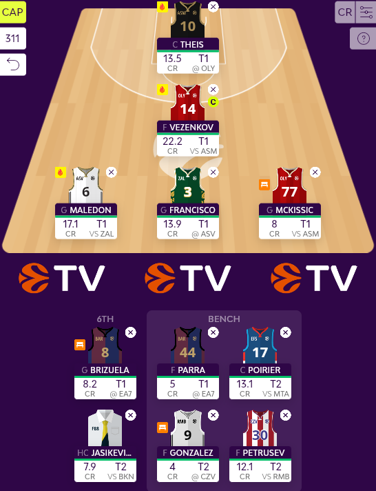 Στη θέση του προπονητή, Μπάνκι και Σάρας μοιάζουν με τις ιδανικότερες επιλογές, με τον Μεσίνα να μου προκαλεί κάποια προσοχή, λόγω κρέντιτς. Εδώ θα πάω μάλλον οριακά στον Σάρας, λόγω 0,1 κρέντιτ λιγότερου, αλλά και διότι την επόμενη αγωνιστική παίζει ξανά εντός (έστω και με την Μπαρτσελόνα), ενώ η Εφές θα αντιμετωπίζει τον Ερυθρό Αστέρα στο Βελιγράδι. Εν ανάγκη δηλαδή, θα μπορούσε να παραμείνει.