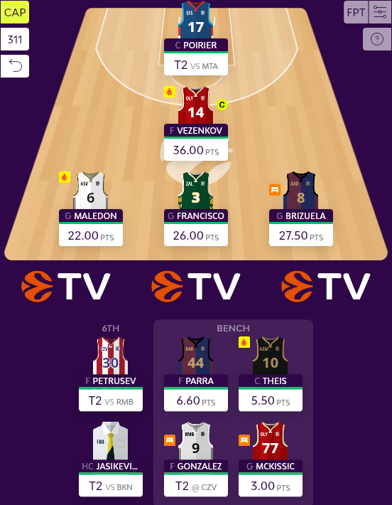 Αρχικά, ο Maledon, που ήταν το μεγάλο όνομα στο σχεδιασμό της ομάδας, ξεκίνησε πολύ δυνατά στο πρώτο ημίχρονο (18) με την Ζαλγκίρις, ωστόσο δεν συνέχισε στον ίδιο ρυθμό κι έτσι "έμεινε" στο 20 PIR και στο 22 fantasy score έχοντας 19 πόντους, με 4/6 δίποντα, 1/4 τρίποντα, 8/9 βολές από 6 κερδισμένα φάουλ, 6 ασσίστ και 4 λάθη σε 28:11. Οι προσδοκίες που δημιούργησε ο Γάλλος κατά τη διάρκεια του αγώνα ήταν υψηλότερες, όμως δεν μπορώ να πω ότι απογοήτευσε κιόλας. Όλα καλά εδώ.