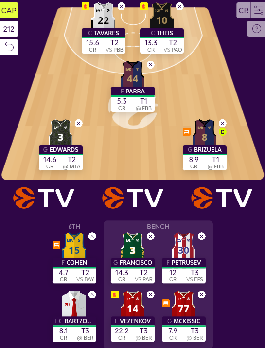 Μπαρτζώκα, εξοικονομώντας μια επιπλέον κίνηση την τελευταία αγωνιστική με τον Ολυμπιακό να υποδέχεται την Μακάμπι. Ο Σάρας θα μπορούσε ίσως να παραμείνει εντός έδρας με την Μπαρτσελόνα, όχι με ενθουσιασμό φυσικά, αλλά σε μια αγωνιστική χωρίς πολλά ξεκάθαρα φαβορί, ο Λιθουανός δεν είναι απαραίτητο να αποχωρήσει. Εφόσον όμως, για την ώρα τουλάχιστον, δεν υπάρχει η ανάγκη τέταρτης αλλαγής στο ρόστερ, αγοράζω την πολυτέλεια αυτή για την επόμενη, ίσως ακόμα πιο απρόβλεπτη, αγωνιστική.