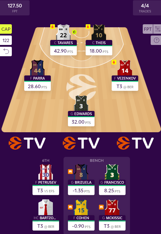 Για το Turn 3, Vezenkov και Petrusev μπαίνουν βασικοί αντί των Francisco και Cohen. Θα μπορούσε να παραμείνει ίσως ο Γάλλος στο βασικό σχήμα, αλλά το περιθώριο κέρδους δείχνει μεγαλύτερο από αυτό της ζημιάς για τον ψηλό του Αστέρα κι έτσι ο Petrusev θα δώσει το 100% του σκορ του.