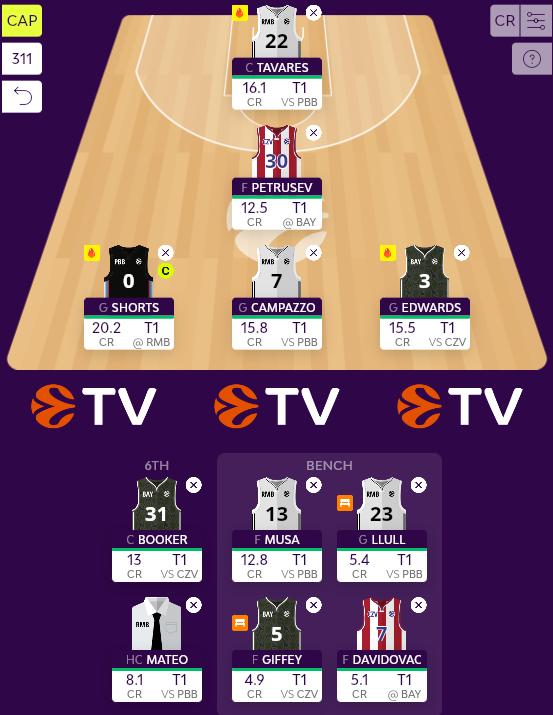 Θεωρώ ότι υπάρχει μια πεντάδα παικτών που δεν θα αλλάζει σε καμιά πρωταρχική ομάδα του παιχνιδιού. Ο λόγος για τους Tavares - Petrusev - Shorts - Campazzo - Edwards, που αποτελούν τα πρώτα φαντασιακά ονόματα των ομάδων τους. Αυτοί ακριβώς θα έρθουν και στην High Voltage.