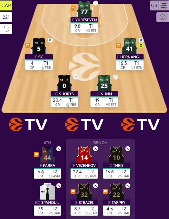 Πλήρως την επιλογή του δικαίωσε και ο Theis, με το δικό του 25,3 κόντρα στην Μπαρτσελόνα, απέναντι στην οποία είχε 22 πόντους με 6/7 δίποντα, 2/5 τρίποντα, 4/4 βολές, 5 ρημπάουντ και 2 μπλοκ σε 22:40! Στην αντίπαλη πλευρά, Parra (9) και Brizuela (6) έμειναν στο μονοψήφιο, χαμηλότερα δηλαδή από το σκορ του Yurtseven (13,2) που πέρασε για χάρη τους στον πάγκο, με τον πρώτο βέβαια να έχει πιο τίμια παρουσία με 5 πόντους και 5 ρημπάουντ σε 20,5 λεπτά συμμετοχής, την στιγμή που για τον Brizuela δεν έφταναν οι 13 πόντοι με 3/3 τρίποντα μάλιστα σε 21:47 για κάτι καλύτερο.
