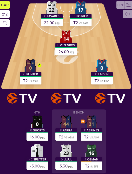 Ενόψει Turn 2 βασικοί περνούν οι Punter, Larkin και Poirier μαζί με τους Vezenkov, Tavares και Shorts. Εδώ είναι συζητήσιμη η παρουσία ενός εκ των Parra και Osman στο βασικό σχήμα αντί του Shorts, ωστόσο το 16 είναι ένας πήχης υπολογίσιμος, που ίσως κρύβει μεγαλύτερο περιθώριο ζημιάς από κέρδους. Έτσι, παρότι ο πήχης τους μπορεί να είναι και ψηλότερος, Parra και Osman λογικά θα παραμείνουν στον πάγκο μαζί με τους Llull και Abrines.