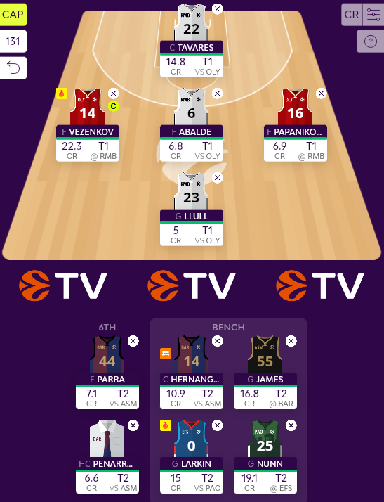 Στη σύνθεση αυτή, το ρόστερ της πρώτης μέρας έχει δύο βαριά χαρτιά (Vezenkov, Tavares) και τρεις πιο τυχοδιωκτικές λύσεις (Abalde, Llull, Παπανικολάου), ενώ στο Turn 2 υπάρχει η τριάδα James-Larkin-Nunn, μαζί με τους Willy και Parra που έχουν αξιώσεις.