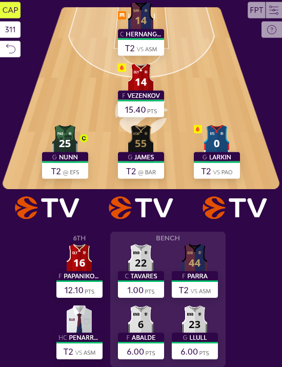 Το κακό είναι ότι δεν υπάρχει κάποιο πολύ μεγάλο σκορ στο ρόστερ ακόμα (Hezonja και Fournier οι καλύτεροι σε όρους ράνκινγκ από χθες), υπάρχουν βέβαια οι λύσεις σήμερα που μπορούν να το προσφέρουν. Nunn, James και Larkin περνούν στο βασικό σχήμα μαζί με τον Vezenkov, ενώ εκεί θα βρεθεί αναγκαστικά και ο Hernangomez, μετά το 2άρι του Tavares.