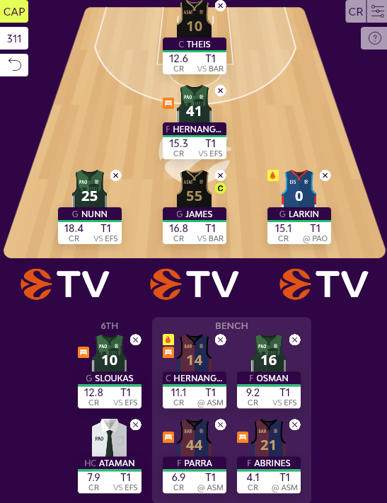 Game 5 ενόψει, με τέσσερις ομάδες ενεργές στο Fantasy, κάτι που σημαίνει ότι παίκτες από Ολυμπιακό (προσωρινά) και Ρεάλ (μόνιμα) βγαίνουν εκτός κάδρου. Οι επιλογές δεν είναι και πάρα πολλές και το περιορισμένο μπάτζετ της ομάδας μάλλον ...απλοποιεί τη διαμόρφωση του ρόστερ, αφού εκ προοιμίου δεν είναι δυνατή η απόκτηση όλων των επιθυμητών στόχων.