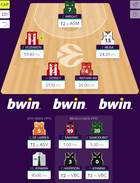 Στην Αθήνα, ο Rathan-Mayes δεν δυσκολεύτηκε να δώσει το πρώτο χτύπημα για την breakout σεζόν που μόλις ξεκίνησε: 18 πόντοι (2/7 δίποντα, 2/5 τρίποντα, 8/11 βολές), 5 ρημπάουντ, 8 ασσίστ και 6 κερδισμένα φάουλ σε 24 μόνο λεπτά προσφέρουν 26 μονάδες ράνκινγκ στις ομάδες που τον είχαν στις τάξεις τους, αλλά και τις προσδοκίες ενός - γιατί όχι - triple double, μέσα στην χρονιά. Την ίδια ώρα, ο Lucic, που εξετάστηκε σοβαρά από την ομάδα έμενε στο 11 PIR, κυρίως γιατί δεν είχε σκορ (ούτε από τα 4 φάουλ που κέρδισε οδηγήθηκε στις βολές), ενώ το ίδιο σκορ (με το 10% της νίκης) σημείωσε και ο Samodurov, που είχε 6 πόντους, 2 ρημπάουντ, 2 ασσίστ σε 10,5 λεπτά.