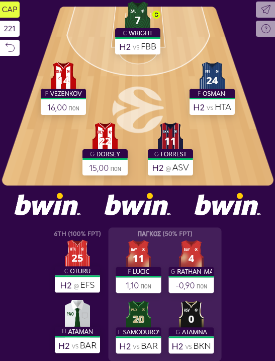 Το μοναδικό ζήτημα αποτελεί η αρχηγία, καθώς αν το 16 είναι για τον Vezenkov ένα χαμηλό σκορ, για τους υπόλοιπους παίκτες του ρόστερ δεν είναι καν δεδομένο κι έτσι εδώ υπάρχει είτε το συντηρητικό σενάριο (32 πόντοι στο σακούλι), είτε το ρίσκο με τη διεκδίκηση ενός υψηλότερου, κυρίως από Wright και Forrest. Η Φενέρ, παρότι δεν έχει σέντερ, δεν μου αρέσει ως αντίπαλος ούτε για το 5, αν και ο ψηλός της Ζαλγκίρις ήταν πραγματικά εντυπωσιακός στο Πριγκιπάτο και εντός έδρας καμιά φορά παθιάζεται και καταφέρνει περισσότερα. Η παρουσία γκαρντ που ξέρουν το παιχνίδι από τους Λιθουανούς αποτελεί ίσως ένα μαξιλαράκι ασφαλείας. Έτσι, θα παίξω και θα δώσω το περιβραχιόνιο στον ίδιο. Όσο για τον Forrest, το εκτός έδρας στοιχείο χαμηλώνει κάπως τον πήχη στο μυαλό μου, με την έννοια ότι ένα πολύ μεγάλο σκορ που θα ξεφύγει ίσως δεν είναι και τόσο πιθανό.