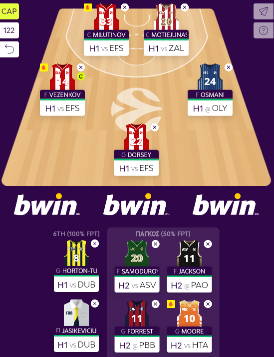 Το βασικό σχήμα συμπλήρωσε από το T1 ο Osmani (18), ενώ στον πάγκο βρέθηκαν οι Forrest (8) και Jackson (7,5) με την πολύτιμη συνεισφορά τους, όπως και οι Samodurov (1,65) και Atamna (-0,5).