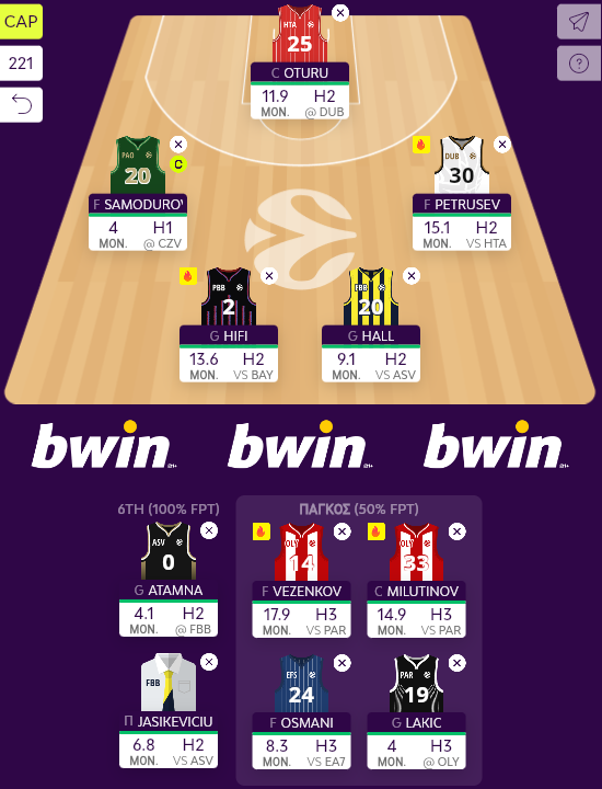 Καλύτερος του Turn 2 της 8ης αγωνιστικής ήταν ο Milutinov, με ένα ακόμα double double (10 πόντοι, 13 ρημπάουντ), συνοδευόμενο από 3 κλεψίματα για 27,5 φαντασιακούς πόντους σε 26,5 λεπτά συμμετοχής απέναντι στην Χάποελ. Ο Vezenkov δεν ήταν εξίσου αποδοτικός, μένοντας στο 16,5, έχοντας 14 πόντους με 4/10 εντός πεδιάς και 4 ρημπάουντ σε 26:07 (κάτι που σε όρους captain μας ωφέλησε), ενώ ερωτηματικό αποτελεί η απουσία του Dorsey από το παρκέ στα 15 τελευταία λεπτά της αναμέτρησης, μένοντας στο φτωχό, για τα φετινά δεδομένα του, 6 PIR, με 11 πόντους και 3 ασσίστ σε 17:42.