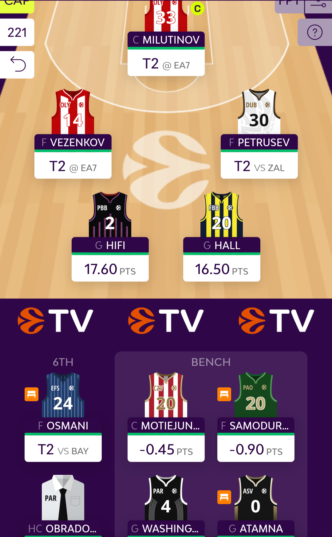 Από το Turn 1 οι Hifi και Hall παραμένουν βασικοί, εκεί όπου θα ανταμώσουν με τους Milutinov, Vezenkov και Petrusev. Το ερώτημα πλέον είναι ποιος εκ των Osmani και Washington θα είναι ο έκτος παίκτης, με την Βιλερμπάν ως αντίπαλος να δίνει πόντους στον γκαρντ της Παρτιζάν και μάλιστα αυτή ήταν η αρχική μου επιλογή, ειδικά με το μείον της Μπάγερν στο 4. Ο Osmani ωστόσο είναι λίγο πιο πυλώνας αυτή την στιγμή στο παιχνίδι της Εφές και μπορώ να τον θεωρήσω πιο safe, επομένως αυτός μάλλον θα βρεθεί τελικά στο βασικό σχήμα.