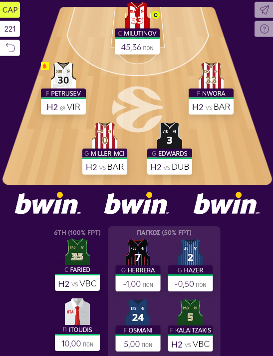 Το Turn 2 φέρνει βασικούς όλα τα βαριά χαρτιά της ομάδας. Petrusev, Nwora, Miller-McIntyre, Edwards, Faried θα κάνουν παρέα στον Milutinov, ενώ ο Osmani και οι Hazer, Herrera θα βρεθούν στον πάγκο δίπλα στον Καλαϊτζάκη (αντί του τραυματία Σαμοντούροφ τελικά) - δεν υπήρξε κάποιο upgrade εδώ, με τον Lucic πάντως να είναι ιδιαίτερα παραγωγικός μέσα στην Παρτιζάν.