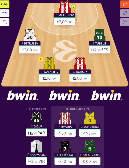 Walker (12,1) και Dorsey (12) παραμένουν βασικοί, με τον Lundberg (4,95 πλέον) να βρίσκει τον Herrera (0,5) στον πάγκο. Εκεί θα πάει και ο Nwora (4,5) που έμεινε στην σκια των Bryant και Butler στην αναμέτρηση με την Χάποελ, ενώ ο Καλαϊτζάκης είχε τυπική μόνο συμμετοχή με την Φενέρ (0). Βασικοί θα περάσουν έτσι οι Tubelis και Diouf, μαζί φυσικά και με τους δύο Σέρβους ψηλούς, ευελπιστώντας σε "όμορφα" σκορ, ειδικά από τον Λιθουανό. Κομβικής σημασίας βέβαια και το αποτέλεσμα στο Βελιγράδι, ενώ για το περιβραχιόνιο του αρχηγού δεν γίνεται συζήτηση.