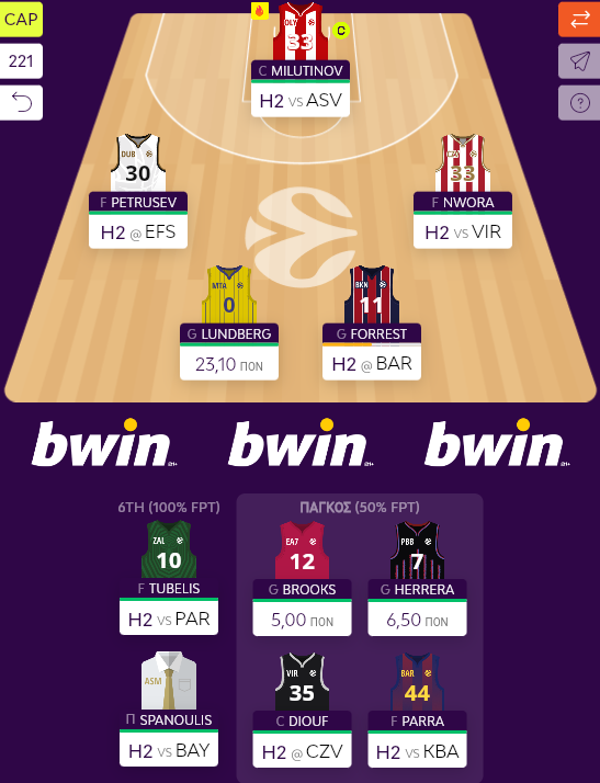 Αυτή ήταν η χθεσινή συγκομιδή κι έτσι ο Lundberg παραμένει βασικός, με τους άλλους δύο γκαρντ να περνούν, σχεδόν αναγκαστικά, στον πάγκο. Milutinov, Petrusev, Nwora φυσικά δεν γίνεται να απουσιάζουν από το βασικό σχήμα, ενώ το potential των Forrest και Tubelis είναι υψηλότερο από το 13άρι του Herrera. ...Parra-λληλα, ο Parra (που προτιμήθηκε τελικά λόγω απουσίας Shengelia) και ο Diouf θα παραμείνουν στον πάγκο, ενώ περιμένουμε και το αποτέλεσμα της Μονακό με την Μπάγερν για τον Σπανούλη.
