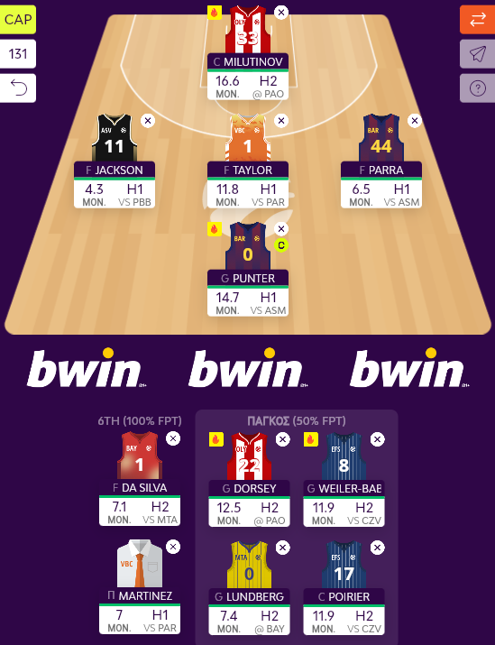 Στο βασικό σχήμα είχαν παραμείνει από το Turn 1 Poirier (26) και Forrest (10), ενώ στον πάγκο είχαν περάσει Jackson (3,5), Parra (1,5), Nwora (-0,5) και Herrera (DNP). Τέλος, ο Μαρτίνεθ έδωσε 10 πόντους με τη νίκη της Βαλένθια επί της Μπασκόνια με 91-81.