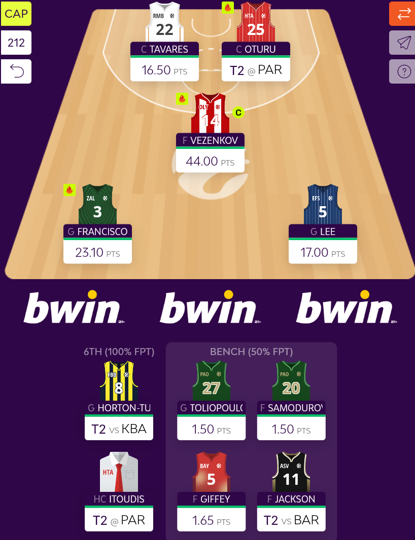 Η εσωτερική διαχείριση της ομάδας ενόψει Turn 2 είναι αρκετά εύκολη. Oturu και Horton Tucker περνούν βασικοί στις θέσεις των Σαμοντούροφ και Τολιόπουλου, ενώ ο Jackson θα παραμείνει στον πάγκο. Το περιβραχιόνιο του αρχηγού θα παραμείνει στο μπράτσο του Vezenkov, καθώς το 22 μπορεί να μην είναι το ιδανικό σκορ από τον “βασιλιά” του Fantasy, για αρχηγό όμως είναι αρκετά ok, ειδικά με όσα περίεργα βλέπουμε όλη τη χρονιά. Oturu και Horton Tucker έχουν τα φόντα να το ξεπεράσουν, αλλά ας το πάμε safe.