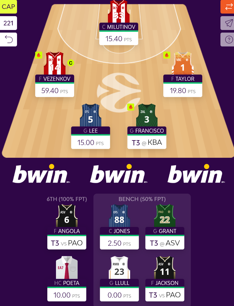 Στο ΣΕΦ, ο Milutinov πράγματι αγωνίστηκε τελικά, αλλά δεν κατάφερε να κάνει τη συνήθη διαφορά, μένοντας στο 15,4 fantasy score, με 8 πόντους και 6 ρημπάουντ σε 19:06. Η απόδοση του Jones ήταν τέτοια, που ο Σέρβος έμεινε εκτός στα τελευταία λεπτά του αγώνα. Την ίδια ώρα, ο Vezenkov έδινε άλλη μια παράσταση με 20 πόντους, 7/14 σουτ, 11 ρημπάουντ και 27 μονάδες ράνκινγκ σε 34:09, για 59,4 αρχηγικούς πόντους.