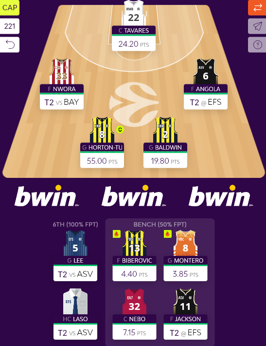Την ίδια ώρα, ο Baldwin είχε πληθωρική παρουσία με 10 πόντους, 4 ρημπάουντ, 6 ασσίστ, 5 κερδισμένα φάουλ και 19,8 fantasy score σε 30:37, ενώ σε πολύ ρηχά επίπεδα κινήθηκε ο Biberovic (8,8), ο οποίος ευτυχώς έσωσε τα προσχήματα στο τέλος και ανέβηκε στους 10 πόντους με 4/6 σουτ και 3 ασσίστ σε 21:52. Καμιά έκπληξη εδώ και το δίλημμα της αγωνιστικής μάλλον βγαίνει χαμένο, αφού ο Hezonja τα πήγε περίφημα με την Μπάγερν (24,2), ενώ απ' την άλλη, ο Montero ήταν ο χειρότερος της βραδιάς για την High Voltage, καθώς η Ζαλγκίρις τον περιόρισε στο 7 ράνκινγκ με 9 πόντους, 3/10 σουτ (μερικά εκ των οποίων απαράδεκτα) και μόλις 1 ασσίστ σε 21 λεπτά χρονικής παρουσίας. Έτσι, ο Hezonja "κέρδισε" από μόνος του Biberovic+Montero, παίκτες που αποτελούν προφανείς επιλογές αποχώρησης πλέον.