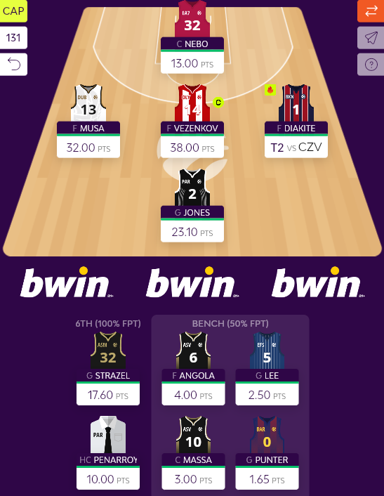 Τέλος, ο Vezenkov ξεκίνησε πολύ ζεστά με την Βαλένθια, αλλά έμεινε στο 19 Index Rating, νούμερο που είναι ok για εκτός έδρας ματς, φάνηκε όμως ότι θα μπορούσε να πάει σαφώς ψηλότερα. Δεδομένων των ειδικών συνθηκών της αγωνιστικής, το περιβραχιόνιο του αρχηγού δύσκολα θα αλλάξει χέρια κι έτσι ο παίκτης του Ολυμπιακού θα δώσει 38 φαντασιακούς πόντους στην ομάδα.