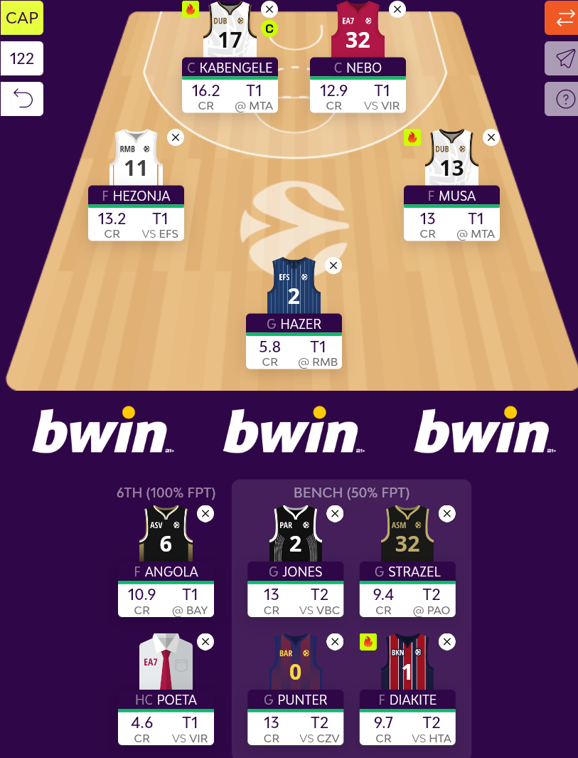 Η αλήθεια είναι ότι οι σέντερ δεν επηρεάζουν ιδιαίτερα τις υπόλοιπες αποφάσεις, εφόσον πάμε στα ακριβά, εκτός κι αν κοιτάξω πάλι πιο εναλλακτικά, σε λύσεις τύπου Jekiri, αλλά νομίζω θα ήταν καλύτερο να μπει ένα ακριβό όνομα, όπως για παράδειγμα ο Kabengele. Ο Wright είναι λιγάκι φθηνότερος και έχει προσιτό για το 5 αντίπαλο, ωστόσο ένα ντέρμπι με την Φενέρ εκτός έδρας δεν ενθουσιάζει έτσι κι αλλιώς. Πάμε αρχικά με Kabengele λοιπόν στη θέση του Massa.
