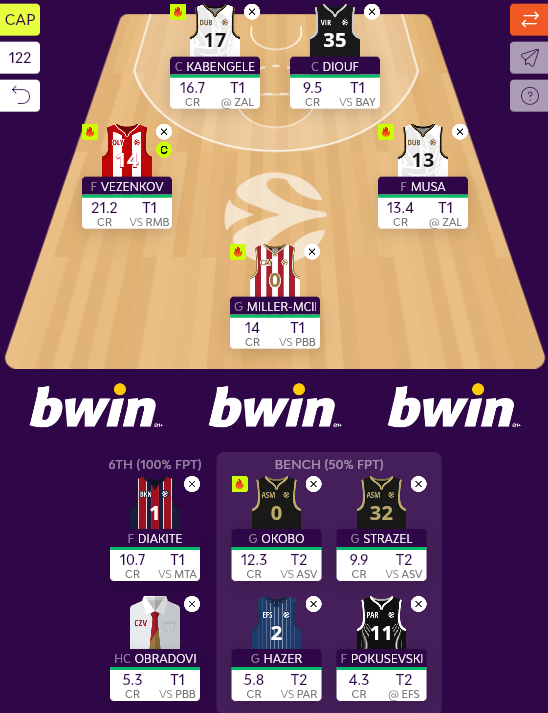 Από εκεί και πέρα, προσανατολίζομαι να αποχωριστώ, προσωρινά τουλάχιστον, τον Milutinov, λόγω του συνδυασμού κόστους (17,3) και Tavares, με τον Σέρβο βέβαια να σημειώνει 17 Index Rating αλλά σε 28 λεπτά στην Μαδρίτη. Εδώ ιδανική εναλλακτική θα ήταν ίσως ο Wright της Ζαλγκίρις, τα μεγάλα σκορ του οποίου έχουν πληθύνει το τελευταίο διάστημα, αλλά η συνύπαρξη με τον Kabengele στο ίδιο ματς, κάπως με αποθαρρύνει. Έτσι, στρέφομαι και στη λύση του υποτιμημένου - για τα εντός έδρας δεδομένα του - Diouf, που αποδίδει σταθερά ανώτερα του κόστους του στην Μπολόνια.