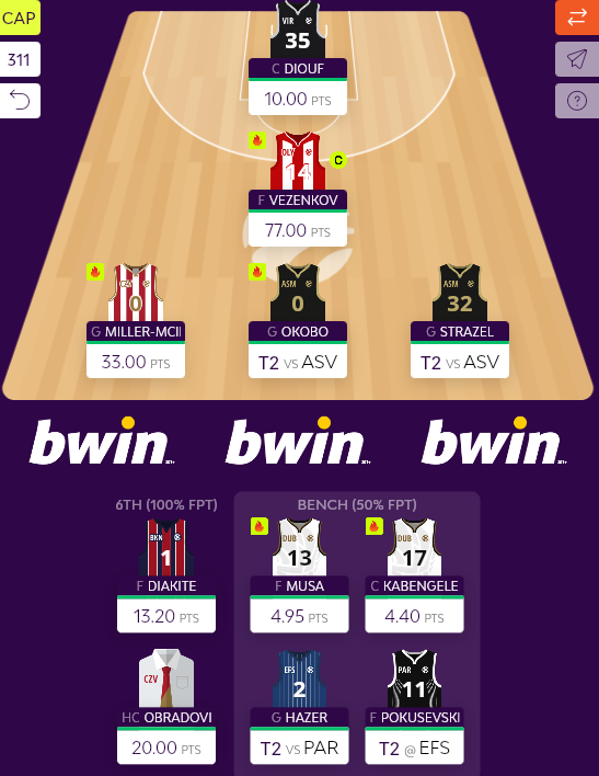 Ενόψει Turn 2, Vezenkov, Miller-McIntyre και Diouf παραμένουν βασικοί, με τους Kabengele και Musa να περνούν στον πάγκο. Στο βασικό σχήμα θα περάσουν οι γκαρντ της Μονακό, Strazel-Okobo, ενώ η τελευταία θέση παίζεται μεταξύ Diakite (13,2) και Hazer. Παρότι ο Τούρκος έχει δείξει ότι μπορεί να το πιάσει και να ξεπεράσει το σκορ αυτό, θεωρώ πιο συνετό να παραμείνουν οι δύο παίκτες ως έχουν.