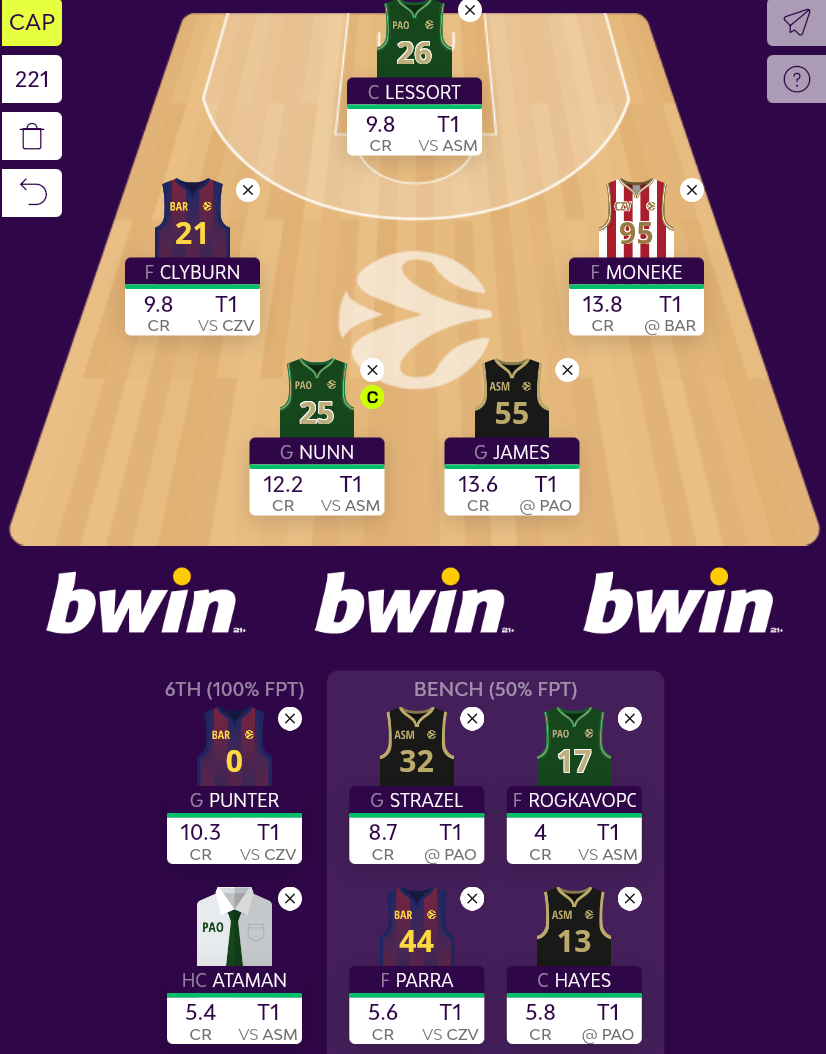 Στους φόργουορντ τώρα, ξέρω σίγουρα ότι θέλω τον πολύ φθηνό (9,8 κρέντιτς) Clyburn, με τον Αστέρα να δίνει ράνκινγκ στο 3, ενώ για οικονομικούς λόγους χρειάζονται και πιο προσιτές επιλογές, όπως ο Parra και ο Ρογκαβόπουλος. Οι τελευταίοι, επιτρέπουν τον ερχομό του Moneke, που είναι τσιμπημένος είναι η αλήθεια, για να συμπληρώσει το βασικό σχήμα. Έτσι, μένουν παίκτες όπως οι Nwora, Diallo και Osman εκτός, κάποιοι μάλλον σκόπιμα (Nwora, παρά τα 10,9 κρέντιτς, λόγω δεικτών Μπαρτσελόνα), κάποιοι λόγω της ιδιαιτερότητας της αγωνιστικής για “ανάγκη” συγκέντρωσης κεφαλαίου στις βασικές θέσεις. Τώρα που τον ξαναβλέπω βέβαια τον Nwora, δεν ξέρω αν πρέπει να τον αφήσω έξω, αλλά συνήθως η αρχική επιλογή επικρατεί.