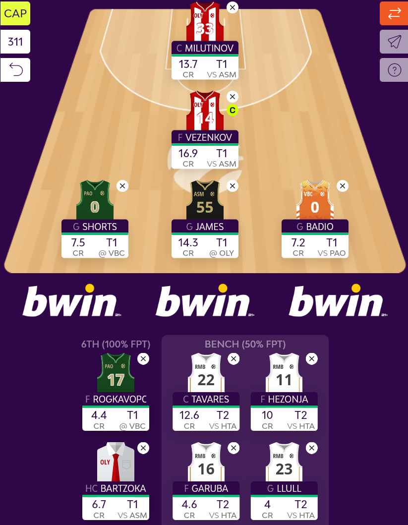Με την παρουσία του Milutinov δημιουργείται μια ισχυρή πεντάδα παικτών (Vezenkov, James, Tavares, Hezonja οι άλλοι τέσσερις), συνοδεύομενη από δύο υπολογίσιμες περιπτώσεις (Badio, Shorts) και τρεις πιο τυπικούς παίκτες. Τα 13,7 κρέντιτς του Σέρβου οδηγούν στα πλέον φθηνότερα στρώματα και σε λύσεις όπως ο Ρογκαβόπουλος (4,4), ο Garuba (4,6) λόγω Τ2 και ο Llull (ή ο Τολιόπουλος). Ιδανικά εδώ θα προτιμούσα, όπως ανέφερα, Sleva (αντί Garuba) και Feliz (αντί Llull).