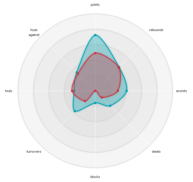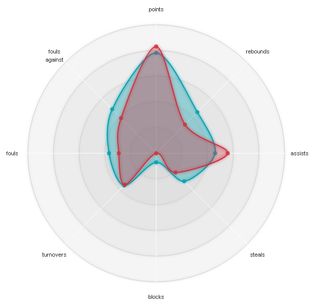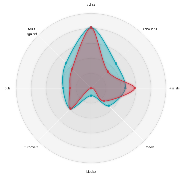 Ο γκαρντ της Μπάμπεργκ έχει γενικότερα πιο πληθωρική παρουσία από τον Σέρβο, όπως και από τους περισσότερους point guards της διοργάνωσης, όπως φαίνεται και στο επόμενο διάγραμμα (το οποίο αδικεί λίγο τον Teodosic, όσον αφορά τη διαφορά σε πόντους και ασσίστ). Επιπρόσθετα, θεωρώ εν μέρει τυχαίες τις κακές εμφανίσεις στο τέλος της regular season για τον Wanamaker, ο οποίος μέχρι τότε είχε σημειώσει μόνο διψήφια σκορ, ενώ η έδρα της Ρεάλ, χωρίς Llull και Rudy μάλιστα, δεν τρομάζει.