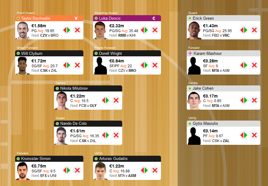 Όπως πάντα, το ρόστερ επιδέχεται αλλαγών, ειδικά εφόσον προκύψουν εξελίξεις (είτε με τον Doncic, είτε γενικότερα). Η παρουσία του Σλοβένου ως αρχηγού δεν ενοχλεί ιδιαίτερα, αφού ακόμα κι αν δεν παίξει, το σκορ του θα το πάρει ο υπαρχηγός. Έτσι, μπορεί να παραμείνει αρχηγός ο Doncic (κι αν οι εξελίξεις δείξουν ότι δεν είναι έτοιμος να αλλάξει βέβαια) και υπαρχηγός να είναι ο Rochestie, λόγω έδρας. Ο τελευταίος προτιμάται του De Colo, καθώς είναι πιο πολύτιμος για την ομάδα του αυτή την αγωνιστική.