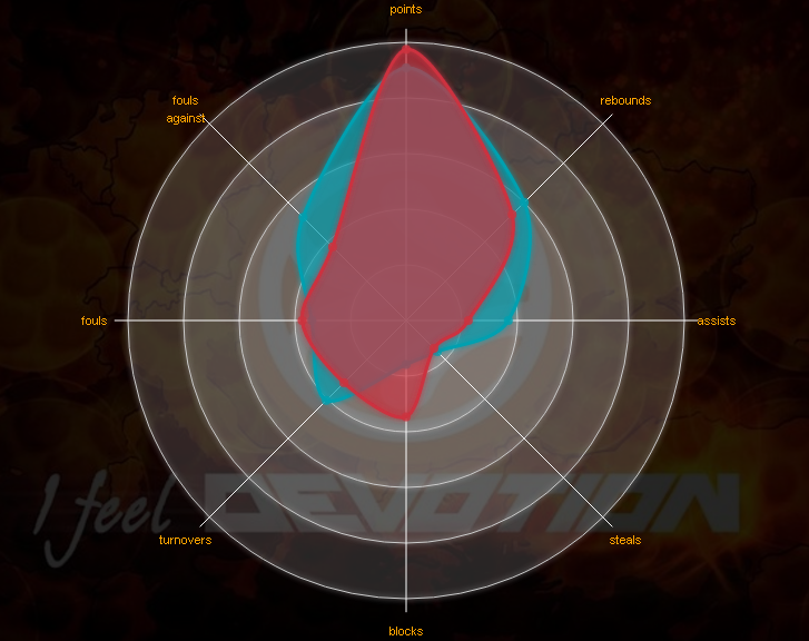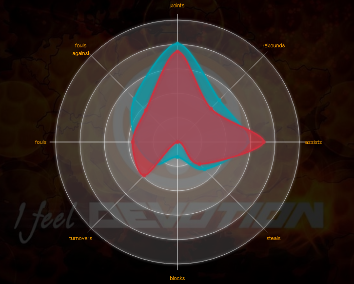 Radar Chart, όπου ο Dixon (με το μπλε χρώμα) είναι καλύτερος σε 7 από τις 8 κατηγορίες, με τον Ισπανό γκαρντ να υπερτερεί στις ασσίστ με 10 αντί 6,7.