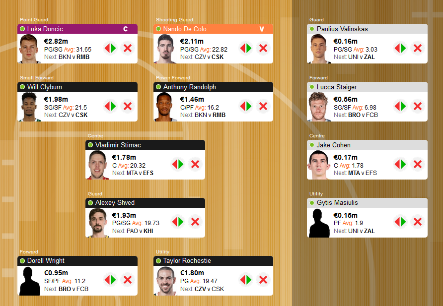 Προφανώς η πρώτη αλλαγή-αποχώρηση θα είναι του Arturas Gudaitis, τόσο λόγω του μικρού τελευταία χρόνου συμμετοχής του, όσο και λόγω της θέσης utility που καταλαμβάνει, όπου πρέπει οπωσδήποτε να μπει ένας γκαρντ. Τη θέση διεκδικούν οι δύο παίκτες που αποχώρησαν πρόσφατα από την ομάδα, Rochestie και Green. Θεωρητικά ο Green έχει πιο εύκολο ματς εντός έδρας με την Μιλάνο και μπορεί να "ξεσπάσει" με ένα πολύ μεγάλο ράνκινγκ. Ωστόσο, το πρόσφατο ιστορικό του που περιλαμβάνει δύο 3άρια, ένα 17, ένα 18 και κανένα από τα δύο πρώτα πολύ μεγάλα σκορ είναι ...απειλητικό για εκ νέου μείωση της τιμής του.